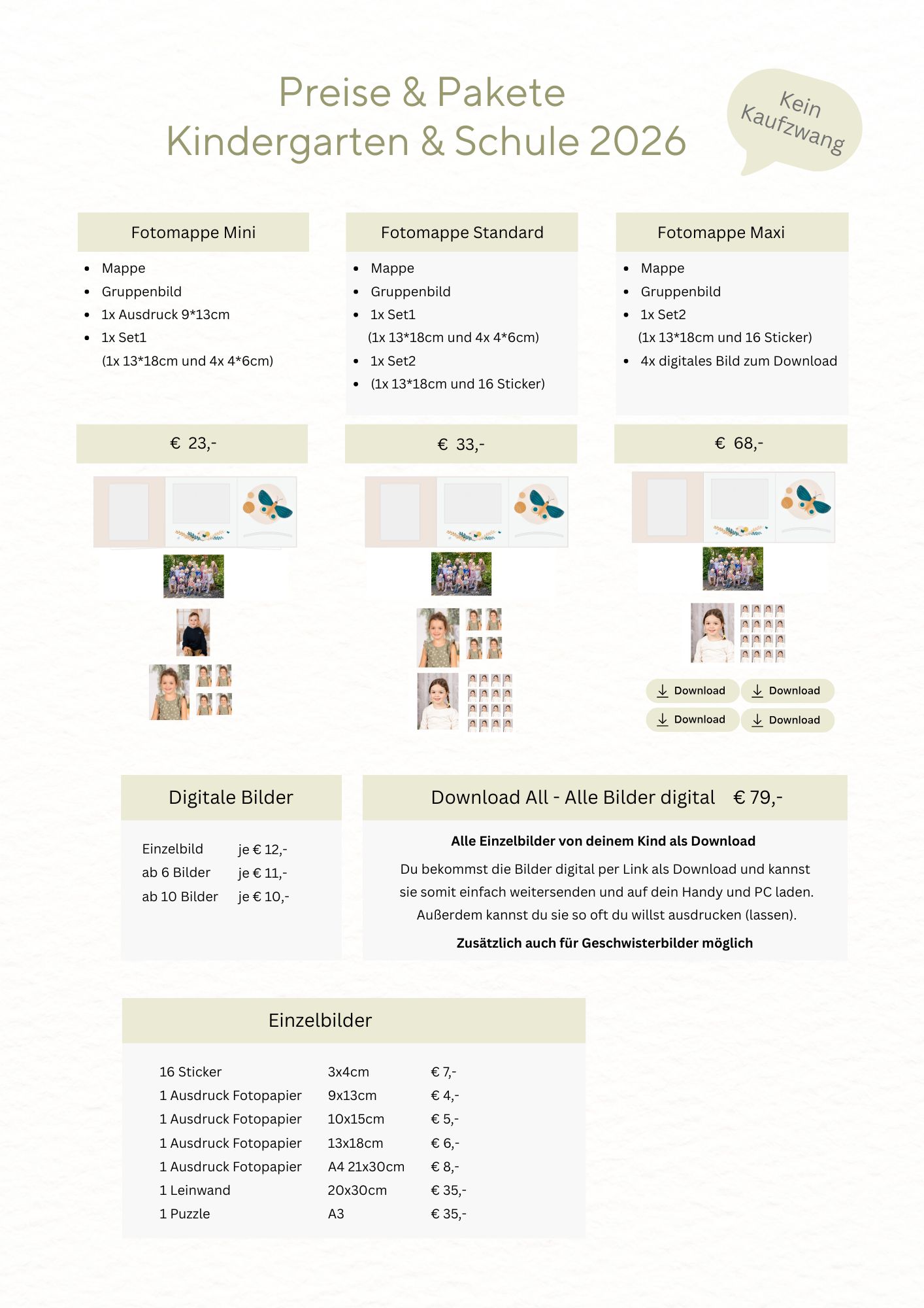 Es gibt keine Kaufverpflichtung und keinen Mindestbestellwert. Die Eltern entscheiden selbst über Anzahl und Art der Produkte. Nachdem die Bestellung abgeschickt wurde, werden Ihre Bilder entwickelt.